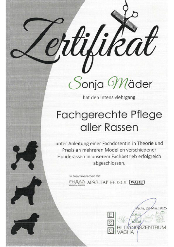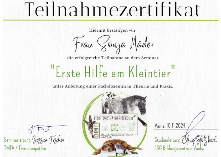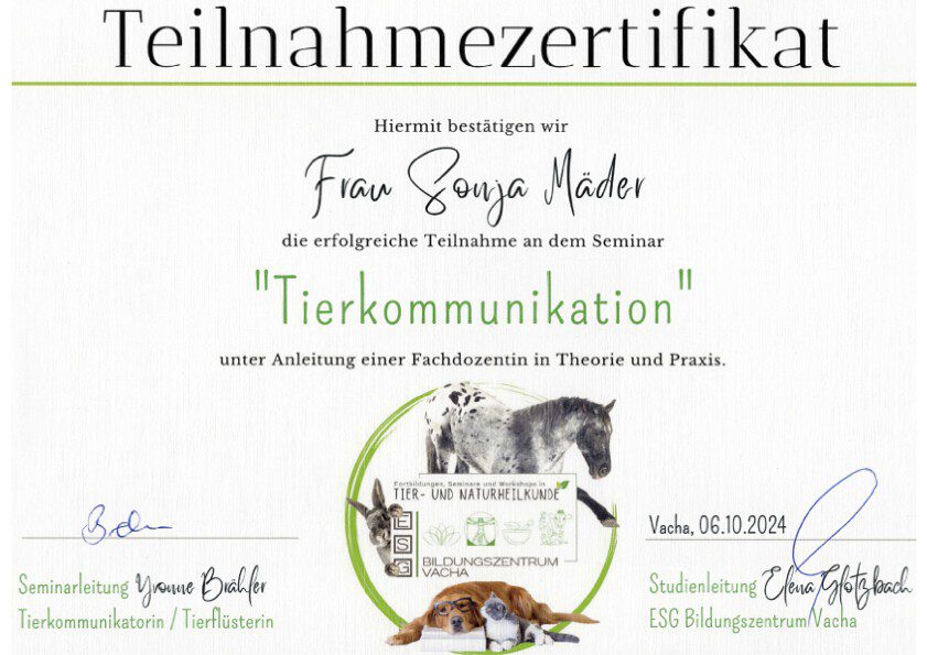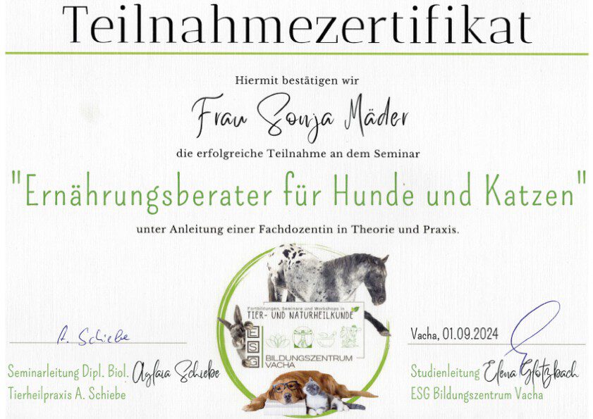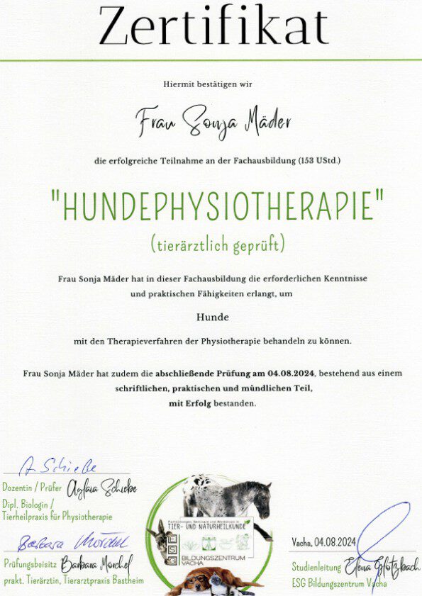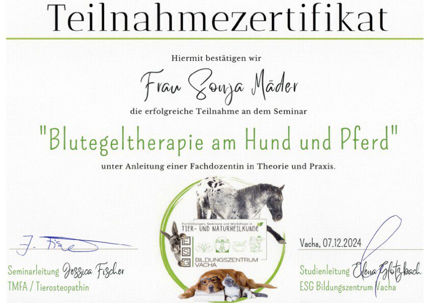 Seit 05/2025 habe ich die Ausbildung zum Osteopathen für Hunde und Pferde begonnen, um mein Leistungsspektrum auf ein ergänzendes, nächst höheres Level bringen zu können.